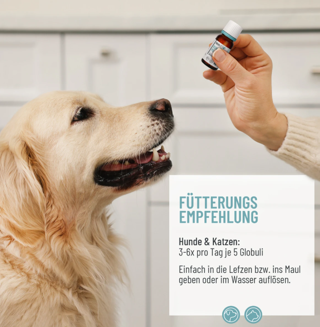 - Hunde & Katzen: 3 - 6x täglich je 5 Globuli