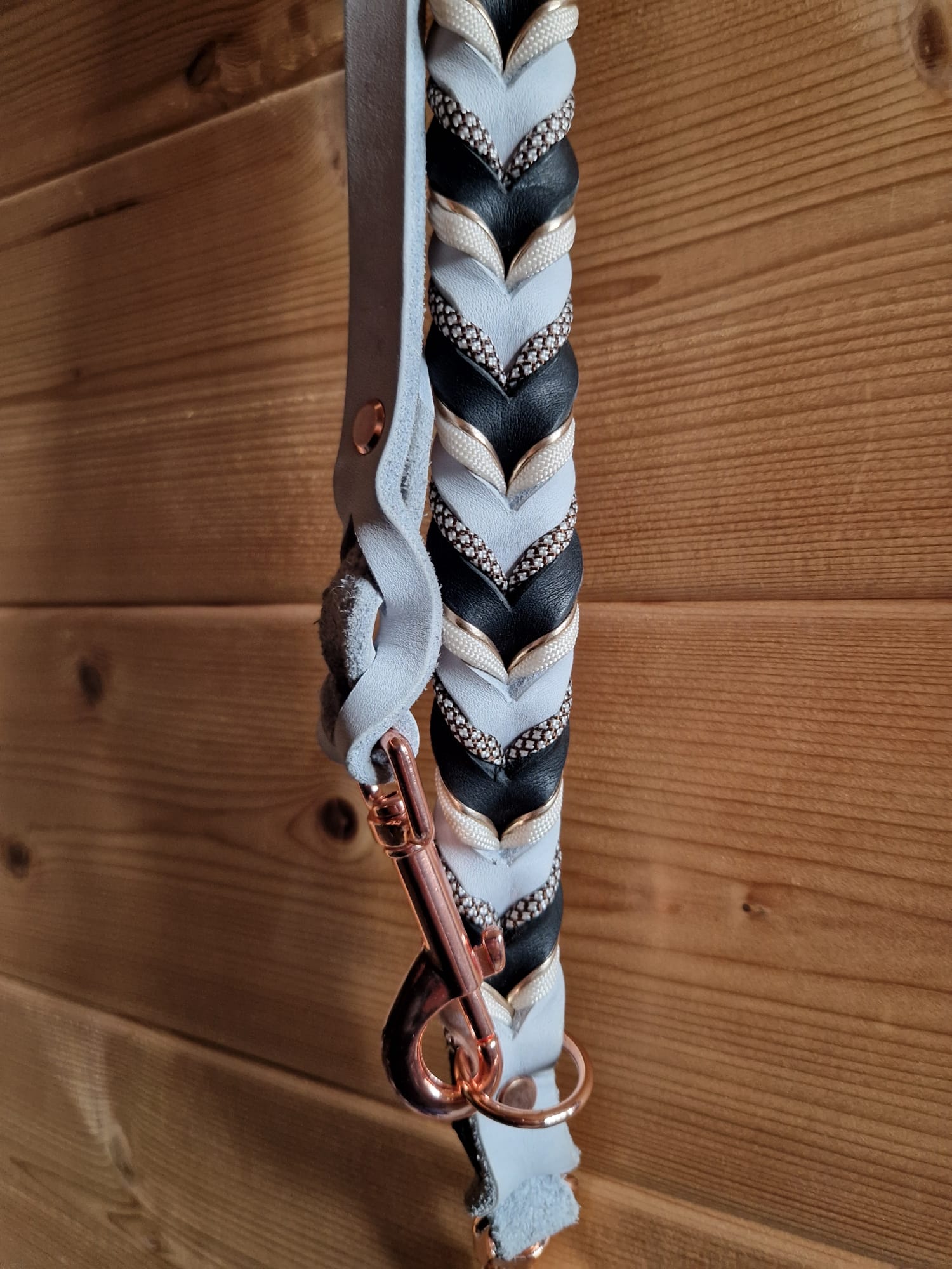 Diese Leine besteht aus Hauptleder in Grau und Nebenleder aus Schwarz dazu verschönert mit dem Paracord in Cream und Walnutcream.