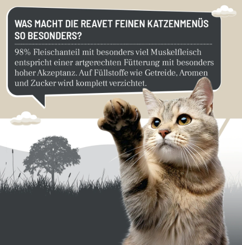 REAVET Huhn mit Ente & Himbeeren – ein raffiniertes Nassfutter für anspruchsvolle Katzen. Mit 98 % hochwertigem Fleisch und besonders hohem Muskelfleischanteil bietet dieses Feine Menü natürliche Aromatik und wertvollen Geschmack ohne künstliche Zusätze. Die schonende Verarbeitung bewahrt die vollständige Fleischqualität und macht das Futter zur idealen Proteinquelle – selbst für wählerische Genießer unwiderstehlich.